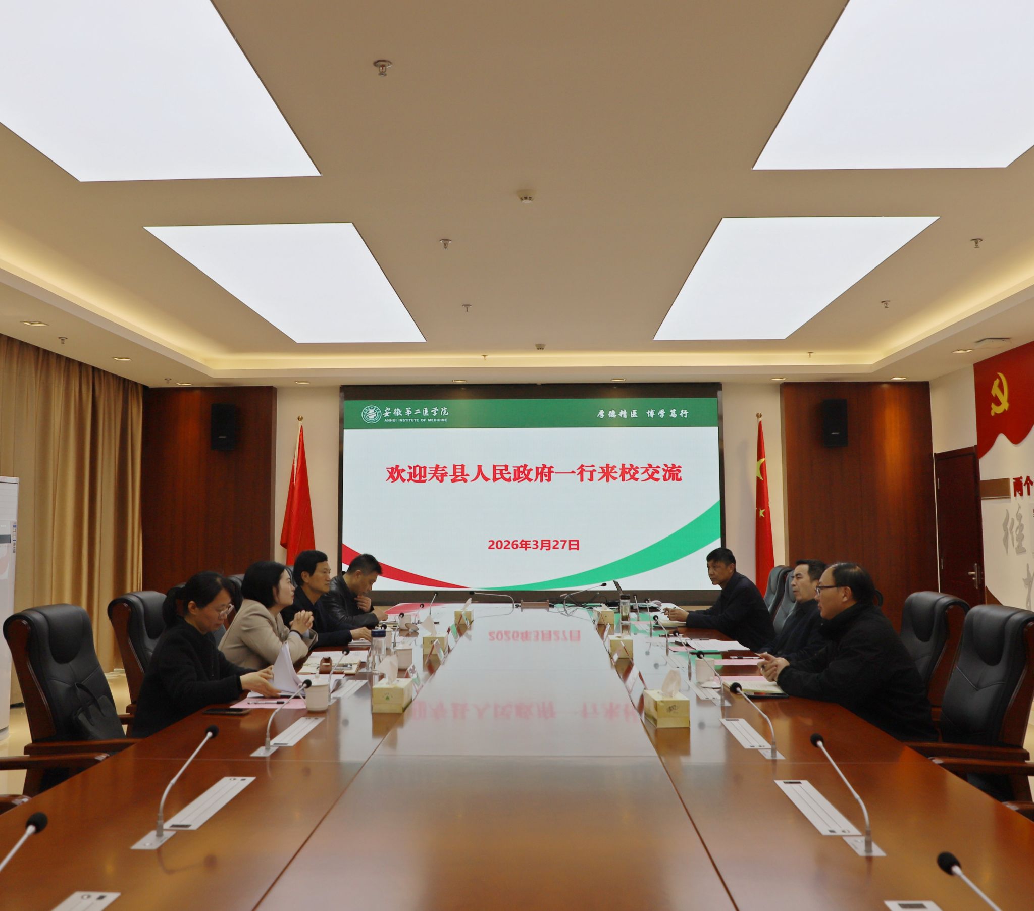 吕雄文代表学校对童丽一行表示欢迎。他指出,校地双方长期保持良好合作关系,寿县县委县政府在学校新桥校区建设、改革发展等方面给予大力支持。当前,学校正积极融入长三角医学教育一体化发展,将充分发挥医学院校在人才培养、科学研究、社会服务等方面优势,以医教研协同创新为牵引,深化与寿县在医疗卫生事业领域的合作,推动政校合作、校地融合走深走实。