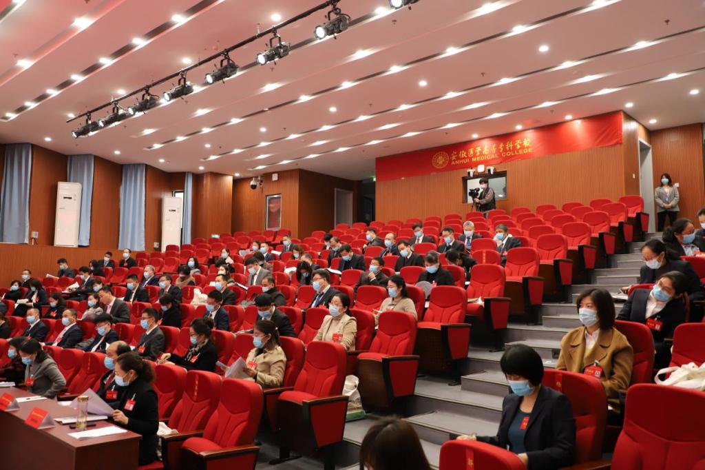 郑为超代表学校作了题为《深入学习宣传贯彻党的二十大精神,奋力书写创建高水平应用型医学本科院校精彩华章》的工作报告。他指出,过去五年来,学校高举习近平新时代中国特色社会主义思想伟大旗帜,全面贯彻党的教育方针,坚持社会主义办学方向,坚持党的全面领导,完整准确全面贯彻新发展理念,围绕“健康中国”“健康安徽”战略需求,准确识变、积极应变、主动求变,抢抓机遇,奋发作为,学校呈现干事创业的良好局面前所未有,办学面貌发生格局性变化前所未有,事业发展态势和办学能级跃升前所未有,立德树人根本任务落实和教育教学改革成效前所未有,治理体系和治理能力现代化推进力度前所未有,民生福祉跨越式提升前所未有。他强调,今后一个时期,要以习近平新时代中国特色社会主义思想为指导,全面学习宣传贯彻党的二十大精神,持续强化党建引领作用,健全内部治理体系;聚焦立德树人根本,培养高素质基层卫生人才;聚力“1333”战略,全速推进升本建设;完善协同育人机制,深化教育教学改革;创新引育用评机制,打造优质师资队伍;服务健康战略需求,规划布局学科专业;提高科学研究水平,推动成果转移转化;拓展对外交流渠道,构建开放办学格局。郑为超指出,我们比历史上任何时期都更接近升本目标,医专人十几年的“两大梦想”即将实现!要坚定历史自信,增强历史主动,锚定学校的第二个梦想,同心同德、埋头苦干,继往开来、奋勇前进,奋力书写创建办学特色鲜明、区域影响显著的高水平应用型医学本科院校精彩华章,为建设现代化美好安徽、建设健康中国和教育强国作出新的更大贡献!为全面建设社会主义现代化国家、全面推进中华民族伟大复兴作出新的更大贡献!