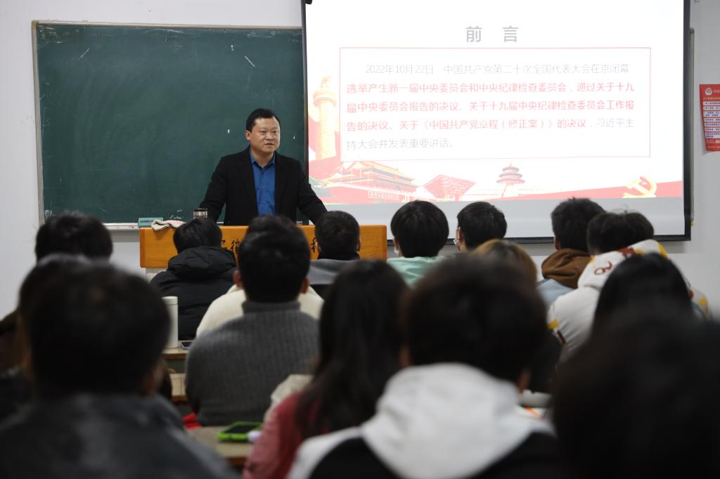 为引导广大师生员工把思想和行动统一到党的二十大精神上来,把智慧和力量凝聚到党的二十大确定的各项任务上来,11月30日,学校党的二十大精神宣讲团开展宣讲。宣讲团团长,党委书记董亚杰,党委副书记、校长郑为超;宣讲团副团长,党委副书记、副校长王劲松,党委委员、副校长王润霞、严继贵,党委委员朱霖、汪长如,深入教学一线,面向学生开展党的二十大精神宣讲。