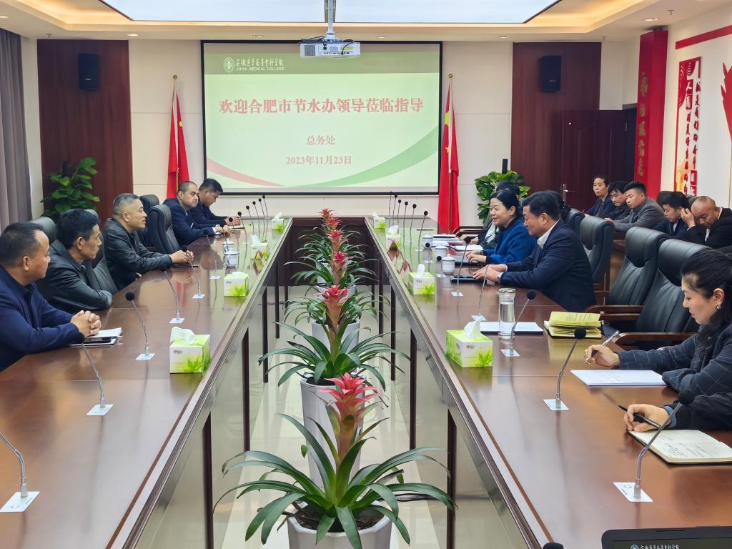 王润霞向合肥市节约用水办公室一行来访表示欢迎,并从学校的历史沿革、办学理念、学生规模、师资队伍等方面简要介绍学校的发展情况。王润霞指出,学校已于2023年被省教育厅评为第二批“安徽省绿色学校”,将以本次入选“安徽省绿色学校”为契机,在合肥市节水办的指导下,对标对表,争取早日评上“安徽省节水型高校”,助力学校高质量跨越式发展建设。
