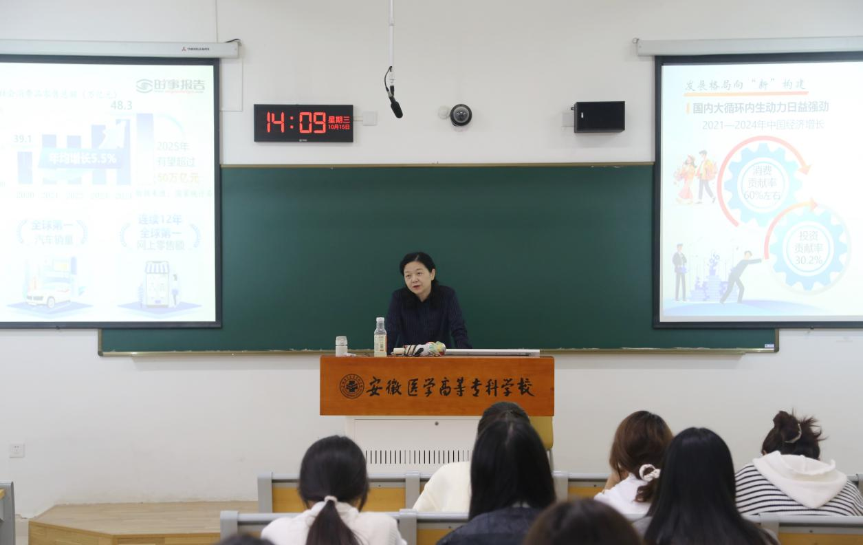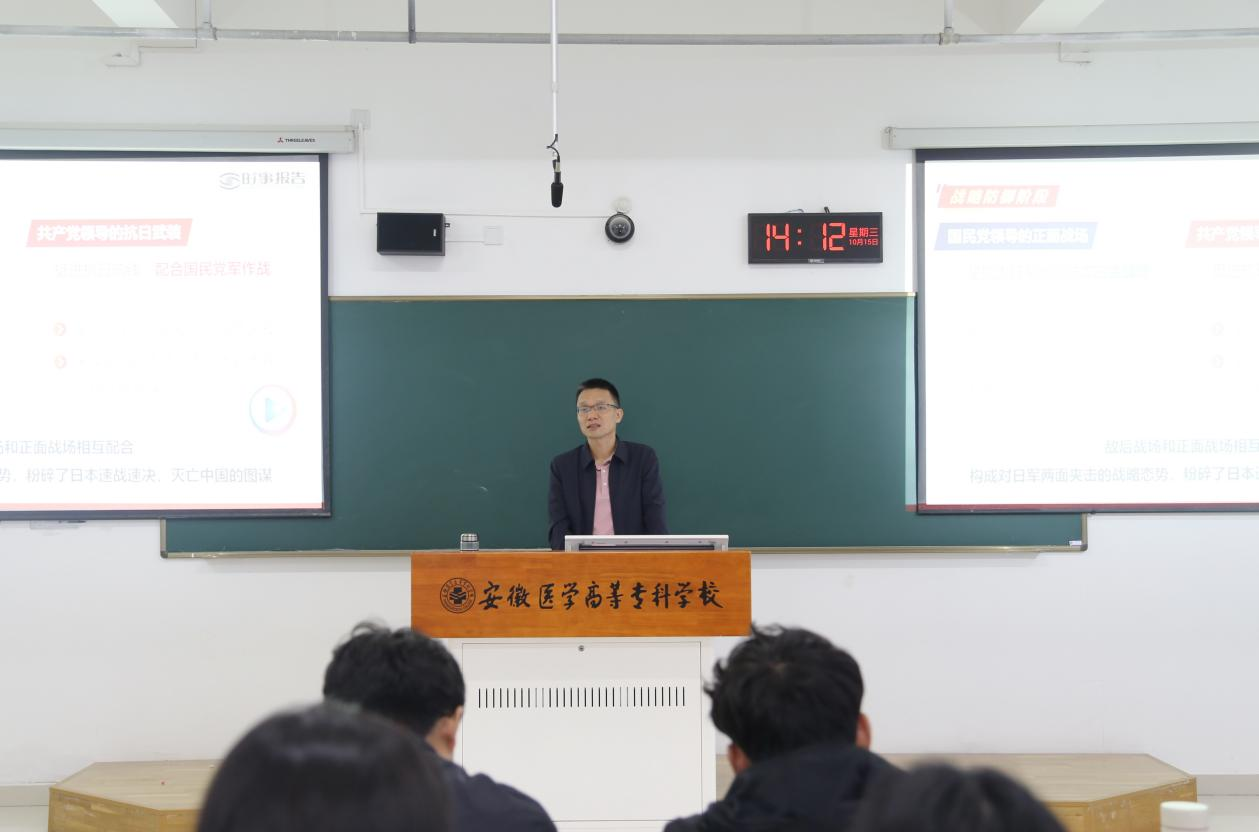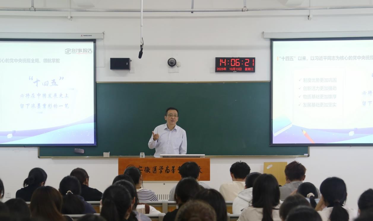 校党委书记姚文兵在《决胜“十四五”奋发向前行》专题授课中,从国家顶层设计到地方创新实践,系统解读了“十四五”规划的战略意图与实施路径。他结合医疗健康领域的鲜活案例,详细阐释了高质量发展的内涵与实践要求。在《纪念抗战胜利坚定民族信念》专题中,通过珍贵历史影像和生动口述史料,带领学生重温抗战岁月,深刻阐释了抗战精神的时代价值,勉励学子将个人理想追求融入中华民族伟大复兴的宏伟征程。