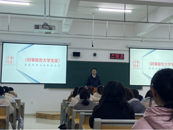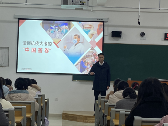 12月2日下午,校党委副书记、校长郑为超在教学楼203教室以“读懂抗疫大考中的‘中国答卷’”为题,给2020级护理1、2班110名学生上了一堂主题鲜明、内容丰富的《形势与政策》课。