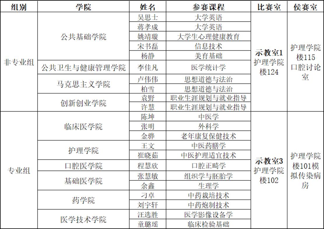 比赛由说课和讲课两个环节组成,分为非专业组、专业组和附属(教学)医院组三个组别进行评审。参赛人员主要采用板书授课,可利用挂图、图片或实物、模型等教具,允许使用多媒体等现代教育技术手段辅助教学。