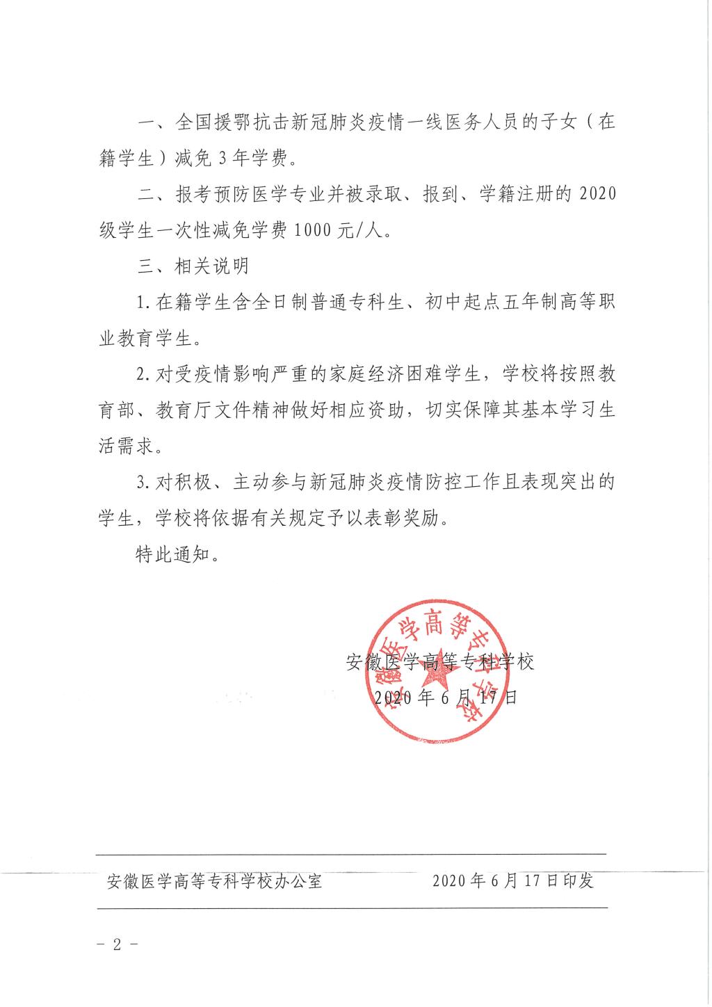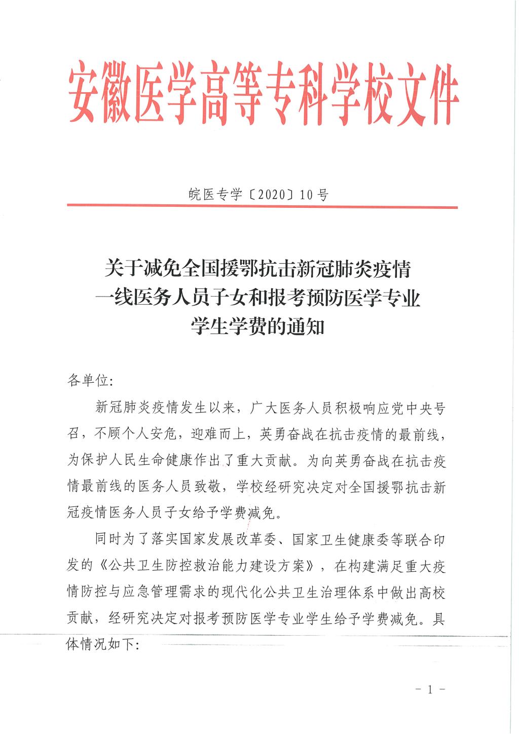 关于减免全国援鄂抗击新冠肺炎疫情一线医务人员子女和报考预防医学专业学生学费的通知