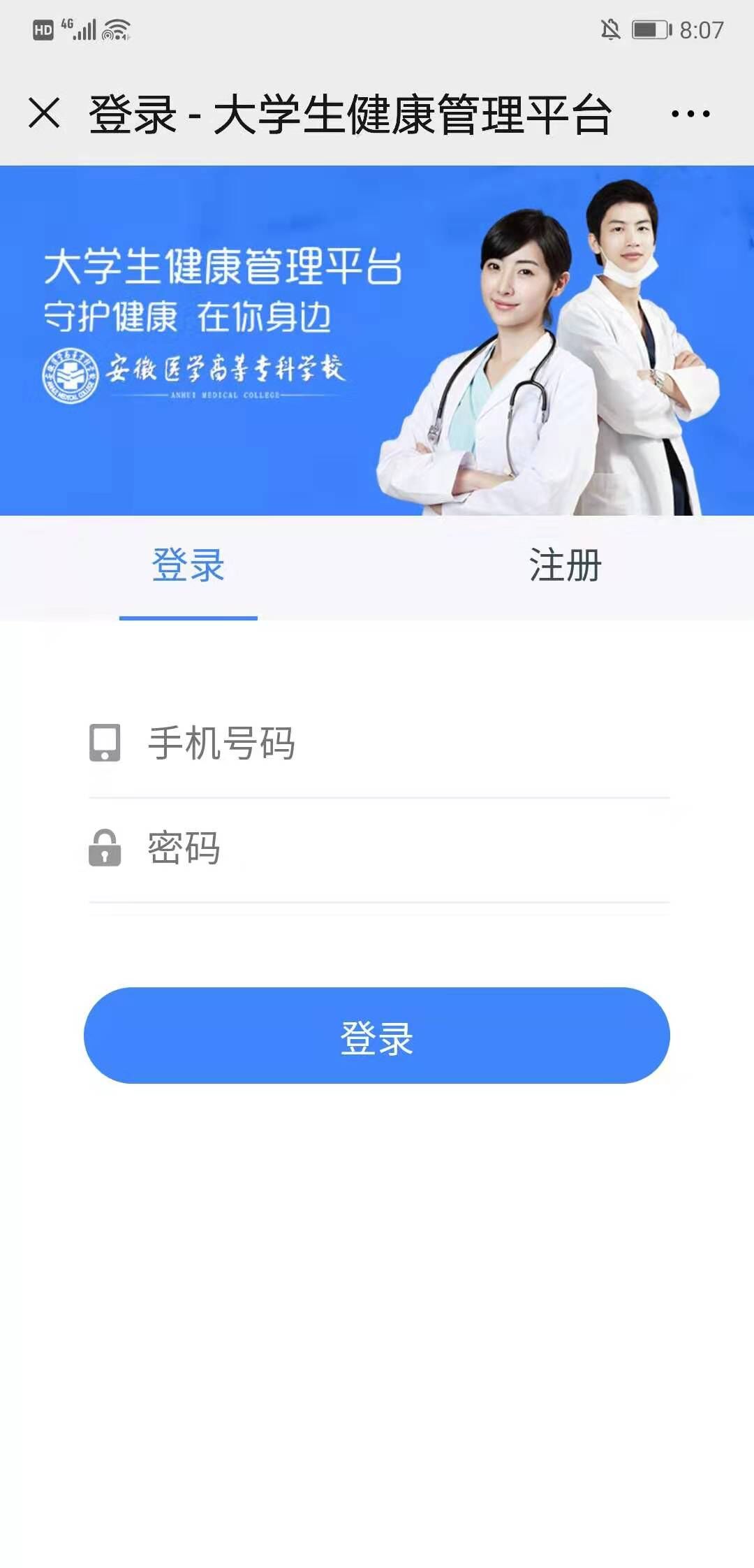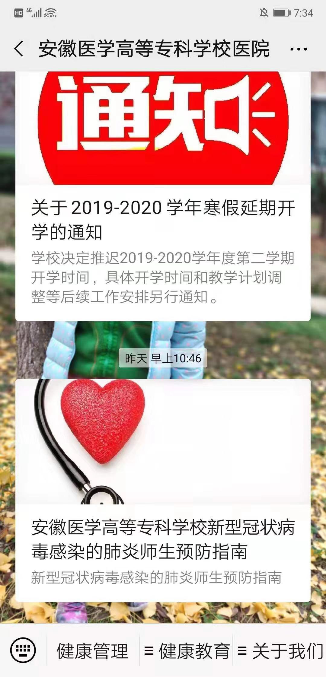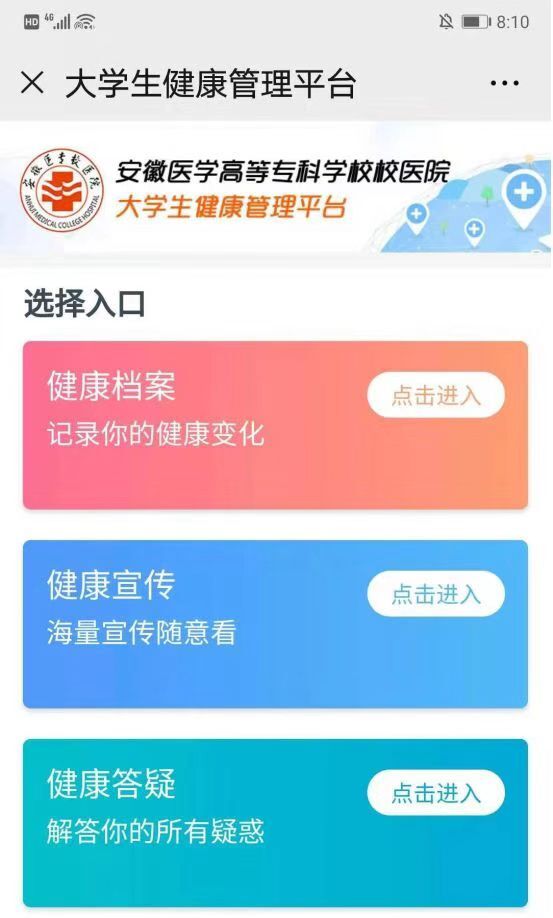 步骤一:关注安徽医学高等专科学校医院公众号。