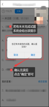 2.核查作答情况时,可修改选择答案;确认无误后,点击最上方的“交卷”按钮,并确认提交。若存在未作答题目,系统会提示,请注意核查。