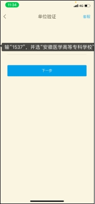 (2)点“下一步”后,在“单位认证”界面输入“1537”,并选择下拉框“安徽医学高等专科学校”,然后点“下一步”输入“身份证号”,然后点击确定,绑定成功并完成登录。具体操作如下图:
